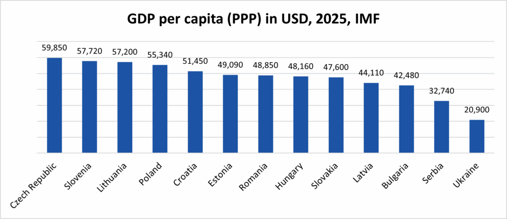 In terms of GDP per capita (PPP), the Czech Republic is currently the leader in Central and Eastern Europe, followed by Slovenia and Lithuania. Over the past decade, Poland has strengthened its economic position, while Croatia has also made solid economic gains.